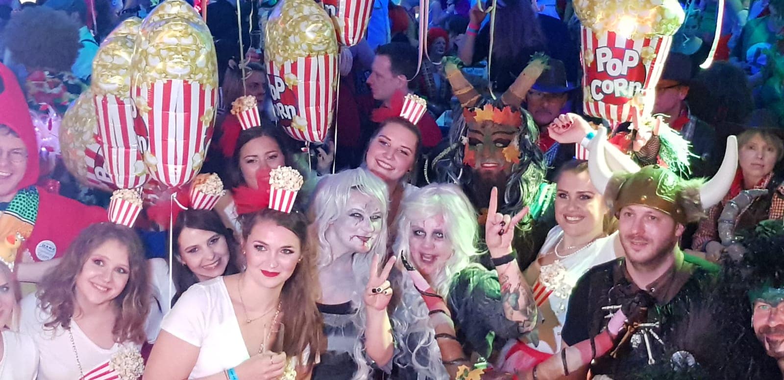 Foto: Die Gewinner der Kostümprämierung 2019 beim Karneval am Silbersee: „Popcorn“ mitten im Gedränge vor der Bühne.