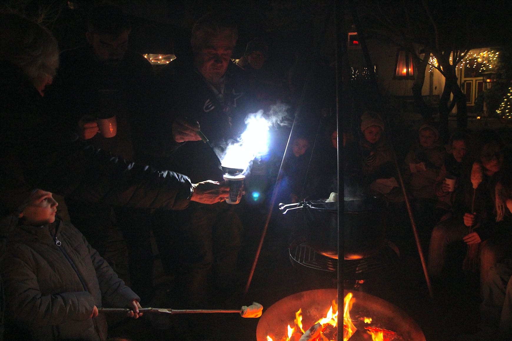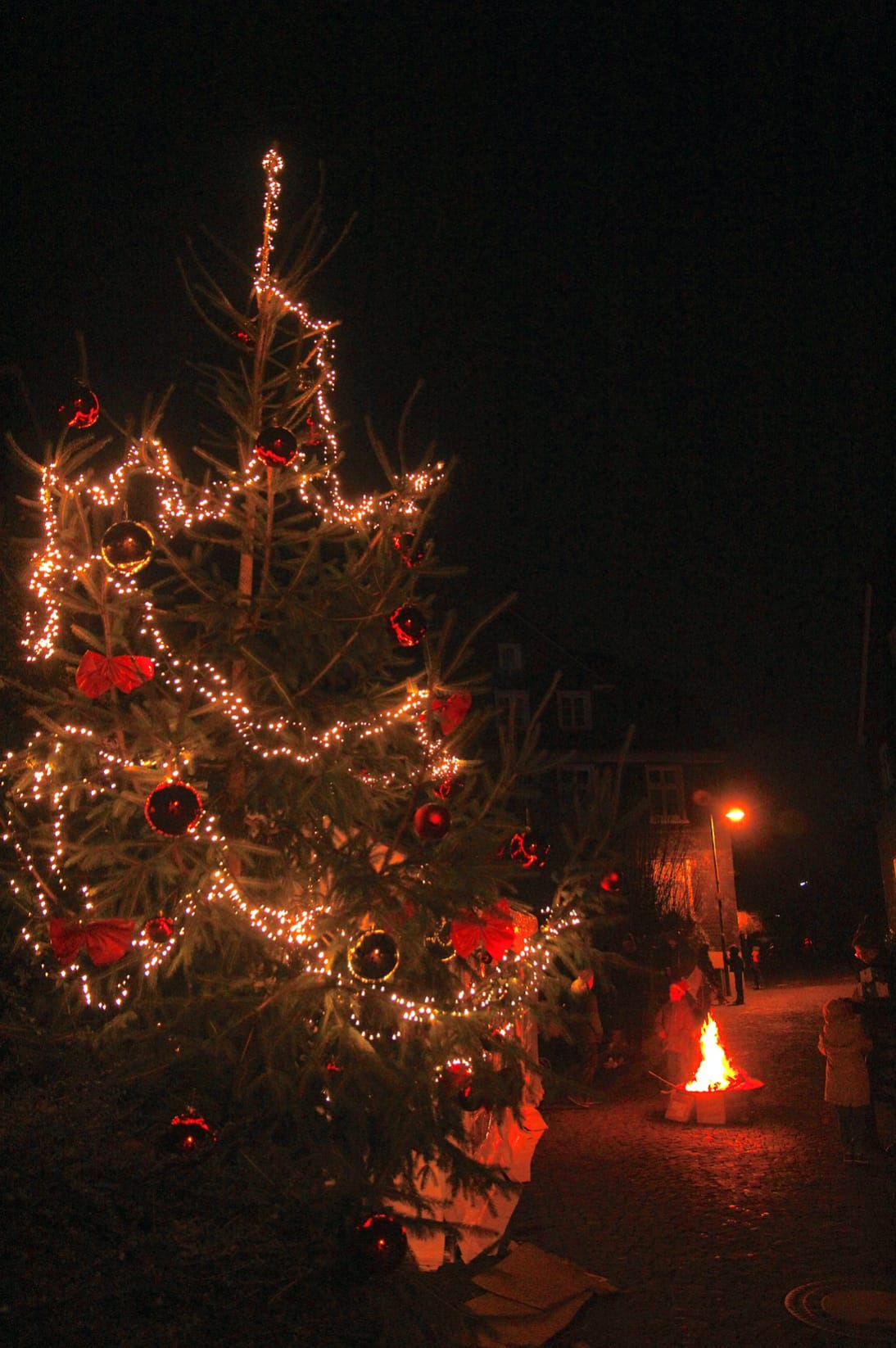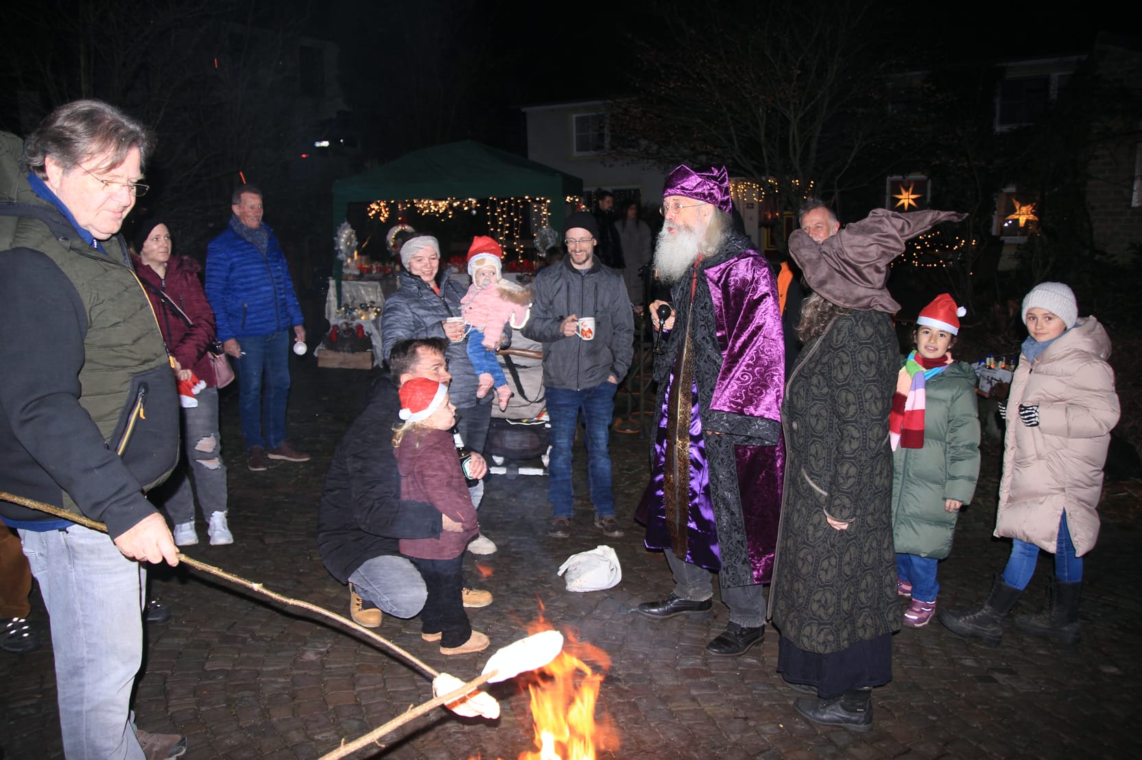 Die Erblandstraße war zu diesem Anlass extra gesperrt worden – wo sonst Autos fahren, standen nun Feuerschalen. An einer brieten die Kinder Stockbrot, auf einer anderen dampfte ein Kessel Feuerzangenbowle, um den die Erwachsenen sich versammelt hatten. Auch der Heilige Nikolaus hatte sich angekündigt, den Kindern die Geschenke zu überbringen, ließ aber zunächst auf sich warten – nicht weiter schlimm, denn auch das Stockbrot brauchte noch etwas Zeit und neben Hot-Dogs und Reibekuchen gab es selbstgebastelte Adventskränze zu erstehen.